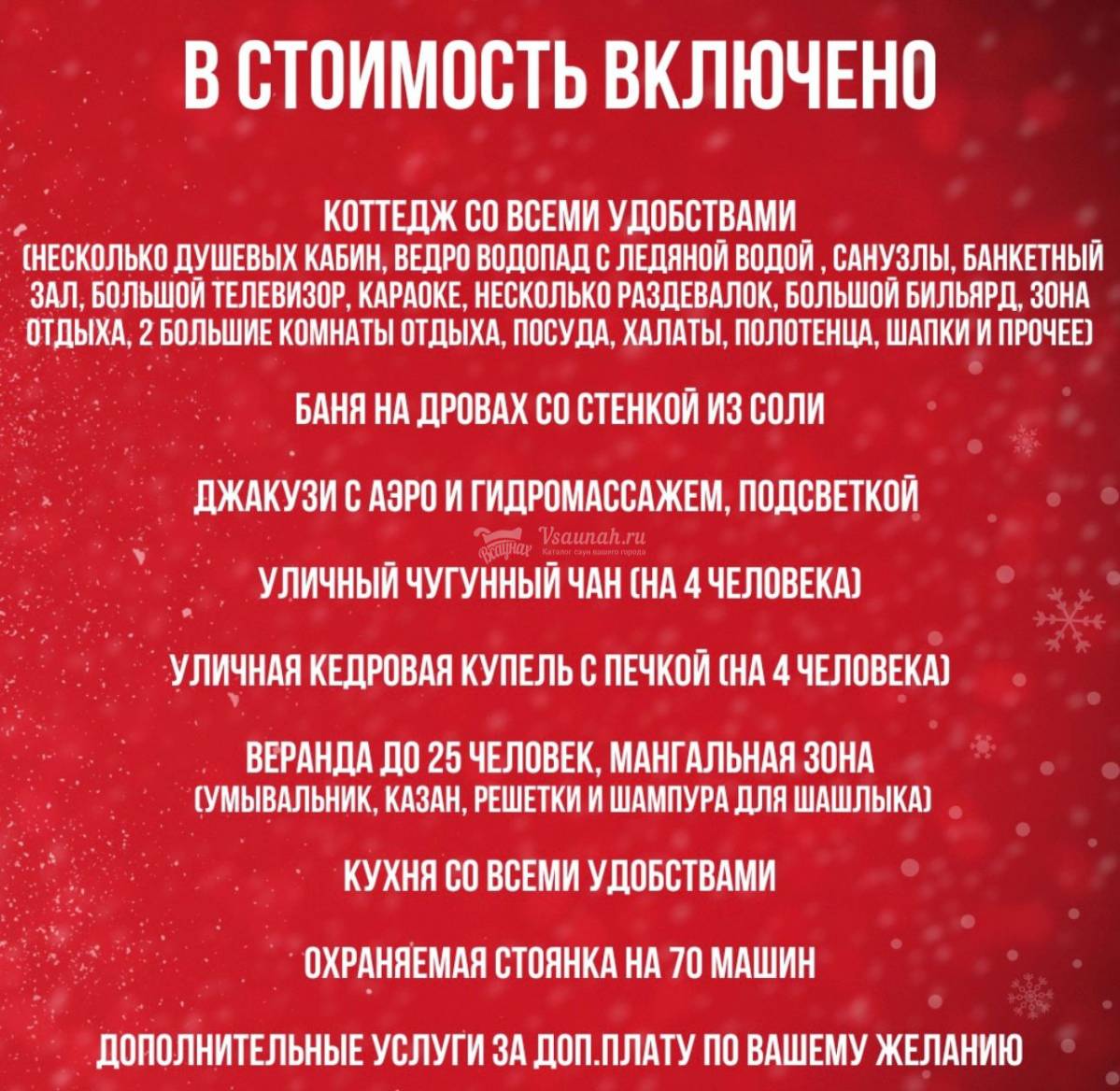За 35000 рублей в сутки и за 3500 рублей в час входят, двухэтажный коттедж, 200 кв.м, со всеми удобствами, баня на дровах, джакузи, душевые кабины, санузлы, банкетный зал до 25 человек, большой телевизор, караоке, раздевалки, на 2 этаже большой бильярдный стол, зона отдыха (нарды, 2 большие комнаты отдыха) уличные кедровые бочки, чугунный чан, бассейн, беседка, мангальная зона, казан, кухня, охраняемая автостоянка, дополнительные услуги. Так же в любой пакет входит: посуда, халаты, полотенца, шапки и прочее.