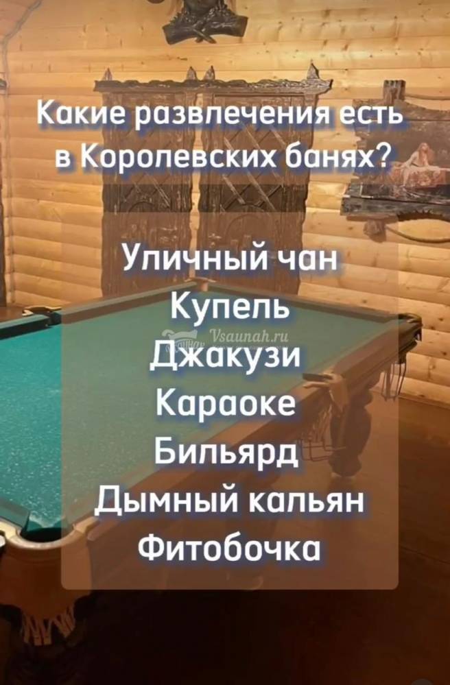 "Королевские бани" - уютные двухэтажные деревянные коттеджи из алтайского кедра на берегу реки со всеми удобствами. Банкетный зал до 25 человек,Настоящая русская баня на дровах с солевой стеной, тёплые полы ,душевые кабины , дубовые вёдра - водопад с ледяной водой ,джакузи с гидромассажем ,фитобочка, бильярд, нарды ,караоке, ТВ, Wi-Fi, кухня, бар, чудесные комнаты отдыха, уличный чугунный чан и кедровые купели с печкой. У нас есть беседка на 25 человек с мангальной зоной, казан , уличные большие бассейны , детские бассейны ,детская игровая площадка , с детскими развлечениями и игрушками , качели , батут , охраняемая стоянка на 70 машин.